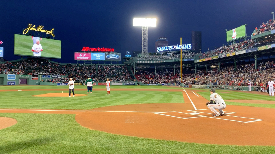 Red Sox legend Carl Yastrzemski throws the ceremonial first pitch at Fenway to his grandson, Mike.