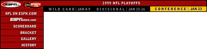 |  | | | Eddie George has topped the 100-yard mark in both the Titans' playoff wins. | In Week 3 at ALLTEL Stadium, Jacksonville owned a 17-7 lead heading into the third quarter but Titans PK Al Del Greco connected on a pair of field goals and QB Neil O'Donnell threw a 12-yard TD pass to TE Michael Roan with just 3:26 to play to give Tennessee a 20-17 advantage. Jaguars QB Mark Brunell guided his team down the field and to the Titans' 3-yard line, but CB Samari Rolle intercepted Brunell in the end zone to end the Jaguars' threat in a 20-19 triumph (the Titans took an intentional safety).